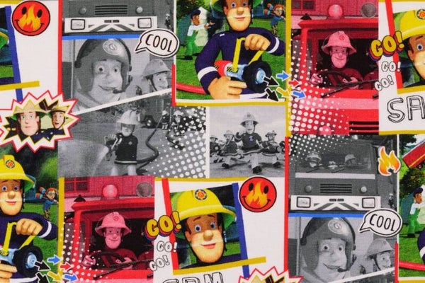 Sehr toller elastischer Baumwoll Elasthan Jersey mit dem Motiv "Feuerwehrmann Sam Comic" der sich bestens für alle Näharbeiten eignet.