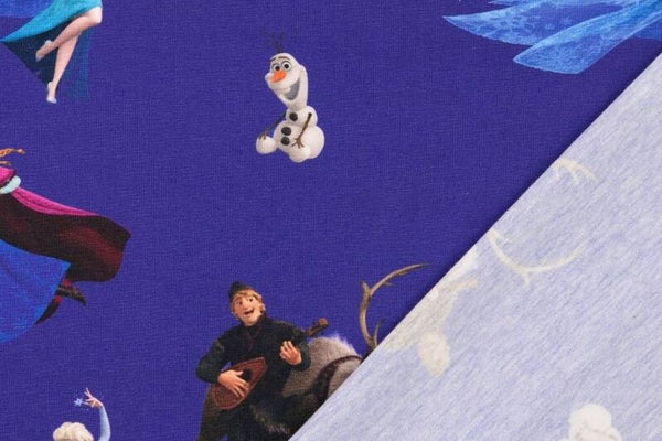 Sehr toller elastischer Baumwoll Elasthan Jersey mit dem Motiv "Eiskönigin" in der Farbe blau der sich bestens für alle Näharbeiten eignet.