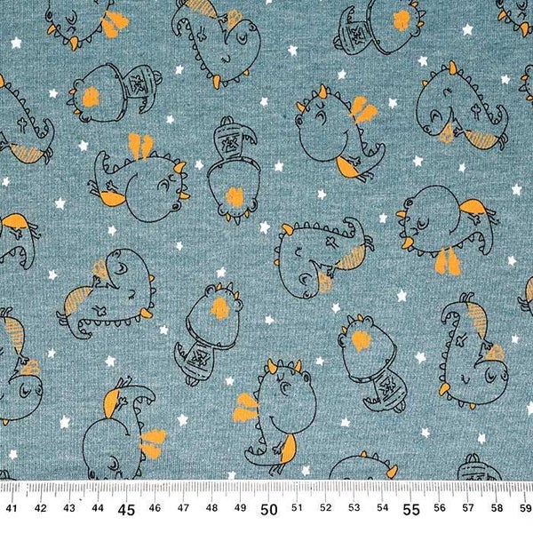 Sehr toller elastischer Baumwoll Elasthan Jersey mit dem Motiv "niedlicher Dino" in der Farbe petrol der sich bestens für alle Näharbeiten eignet.